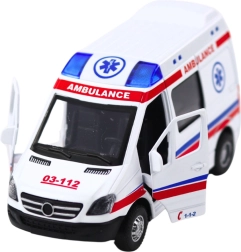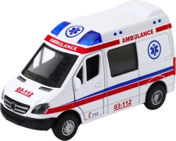 Ez a részletgazdag kidolgozású 1:32 méretarányú mentőautó hűen utánozza a valódi mentőjárművet. A fém karosszéria és a masszív műanyag együtt hosszú élettartamot és vonzó megjelenést biztosít. A „Ambulance” feliratú fehér szín kiemeli a játék realista jellegét.