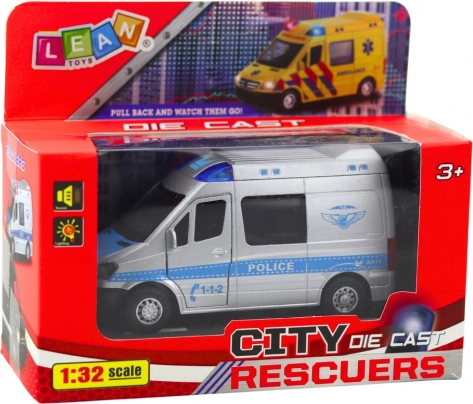 Részletgazdag rendőrautó 1:32 méretarányban, amely a fém karosszériát tartós műanyaggal kombinálja, így stabil, biztonságos és készen áll a mindennapi akciókra. Elég a járművet hátrahúzni, és a visszahúzós meghajtásnak köszönhetően magától előreindul. A nyitható ajtók fokozzák a valósághű játékélményt, míg a fények és hangok megteremtik a megfelelő rendőri akció hangulatát.