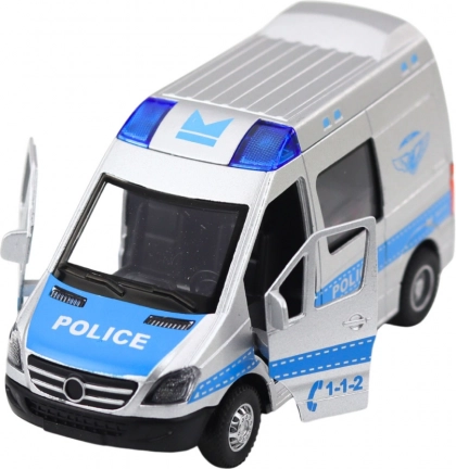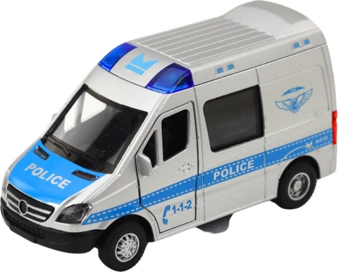 Valósághű rendőrautó modell 1:32 méretarányban fémből és minőségi műanyagból, amely örömet szerez minden kis rend őrének. Kínál visszahúzós meghajtást, nyitható ajtókat és látványos fény- és hangeffekteket. Masszív kialakítás és ezüst szín „POLICE” feliratokkal garantálja a tartósságot és a remek megjelenést játék közben is, valamint a gyűjteményben.