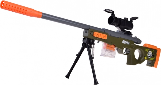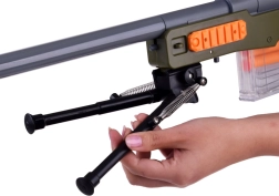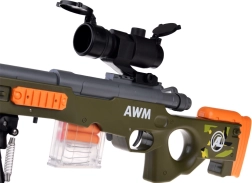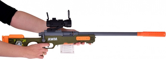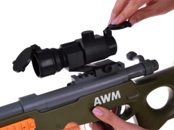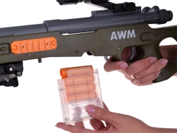 Valósághű játék kis lövészeknek! Ez a könnyű mesterlövész puska habszivacs lövedékekhez mechanikus felhúzással, elemek nélkül, optikai irányzékkal a pontosabb célzáshoz, kivehető tárral és minden újratöltésnél „hüvelykidobás” effektussal rendelkezik. Remek választás biztonságos és szórakoztató akciójátékhoz otthon és a szabadban is.