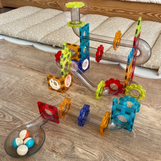 A WOOPIE készlet mágneses lapkákat kombinál az átlátszó golyópálya-elemekkel, hogy a gyerekek végtelen pályavariációkat tervezhessenek és építhessenek. A masszív kapcsolatoknak és a minőségi anyagoknak köszönhetően a szerkezet stabil marad, miközben a golyók egyenletesen haladnak rámpákon, kanyarokon, tölcséreken és alagutakon át. A fizikai elvek tanulása természetes módon fonódik össze a játékkal.