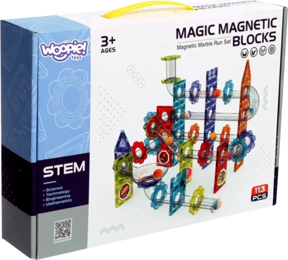 Fedezd fel az alkotás és a fizika világát a WOOPIE kreatív építőkészletével: mágneses golyópálya 113 elemmel. Az átlátszó csövek, színes lapkák és erős mágnesek lehetővé teszik stabil, többszintű pályák építését, amelyeken a gyerekek játék közben ismerhetik meg a gravitációt és a mozgást. Ideális a logikus gondolkodás, a térbeli képzelőerő és a finommotorika fejlesztésére – értelmes, órákon át tartó szórakozás 3 éves kortól.