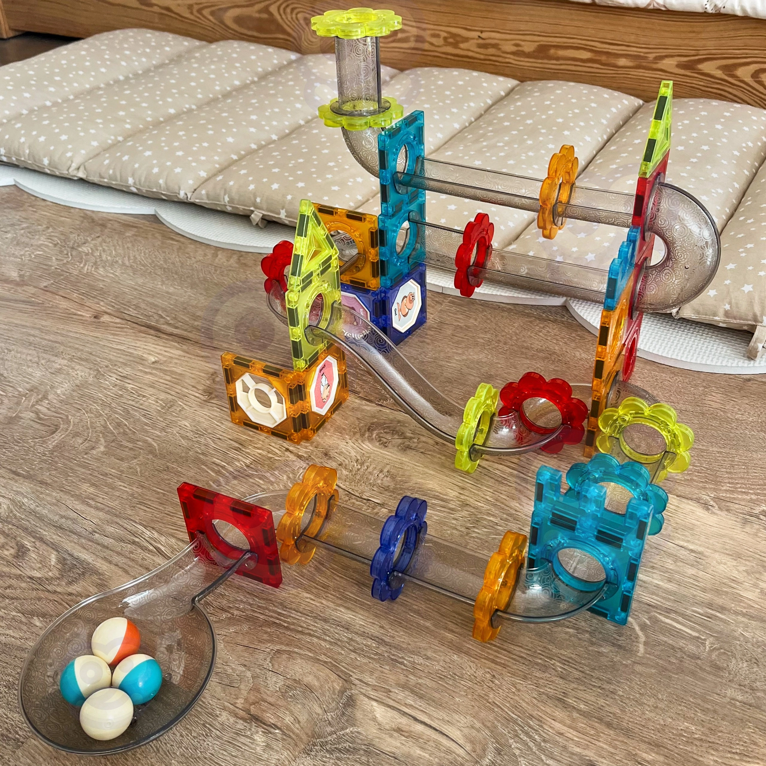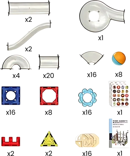 - Különböző alakú és színű mágneses lapkák; átlátszó pályaelemek (vályúk, kanyarok, tölcsérek, alagutak); színes golyók; dekoratív matricák; illusztrált útmutató