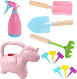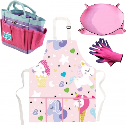 - kertészkötény, rekeszes szerszámtáska, védőkesztyű, kerti lapát, kanál/lapátka, gereblye, permetező, 3 virágcserép, 6 növényjelölő, átültető alátét, unikornis figura