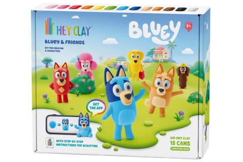 HEY CLAY kreatív készlet Bluey: 15 tégely gyurma, 2 eszköz, készíts 6 figurát. Remek szórakozás és kreativitásfejlesztés 3 éves kortól.