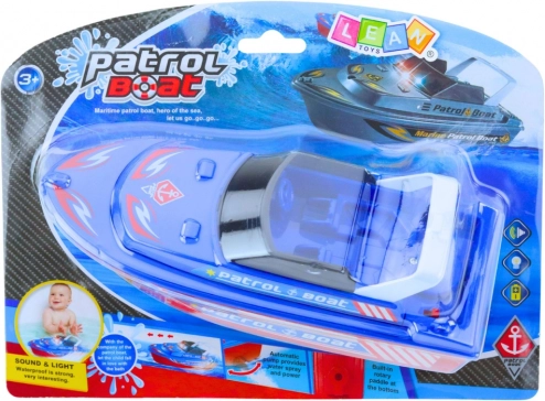 Járőrhajó kádba és medencébe LED fényekkel, hangokkal és automatikus vízpermettel. Biztonságos műanyag, kompakt méretek. Remek szórakozás gyerekeknek.