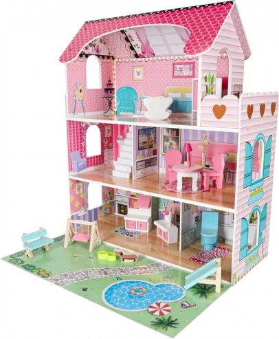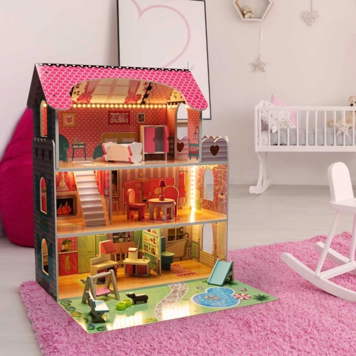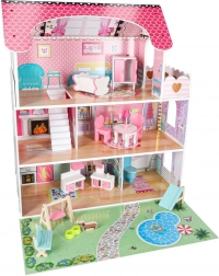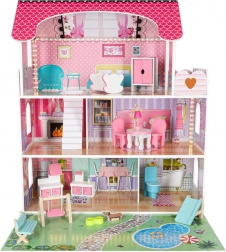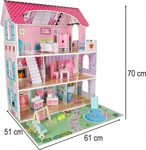 Három szint, erkély, lépcső és kert játszótérrel. A gyerekek szabadon rendezhetik a bútorokat, és végtelen játékszcenáriókat alkothatnak.
