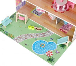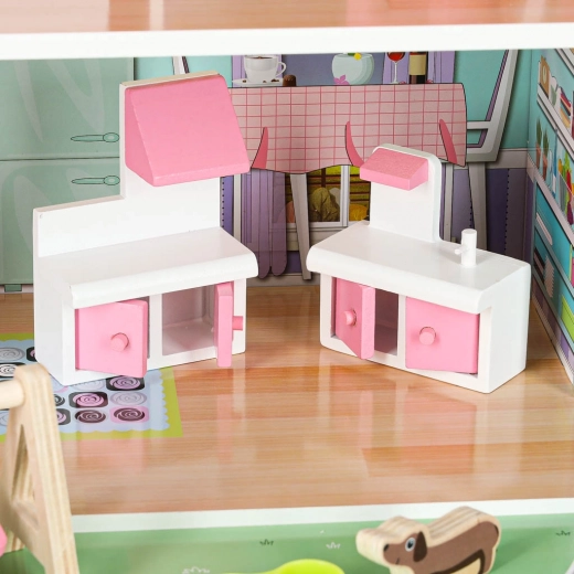 A gazdag tartozékkészletben asztal, 2 szék, hinta, WC, nyugágy, pad, gyerekágy, lámpa, kutyatál, szekrény, tűzhely és mosdó, valamint egy aranyos kutyus figura kapott helyet. A masszív MDF szerkezetnek, a műanyag kiegészítőknek és a fém csavaroknak köszönhetően a ház stabil és ellenáll a mindennapos játéknak.