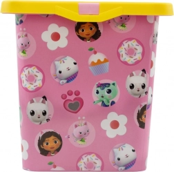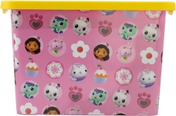 A rózsaszín doboz sárga tetővel és játékos motívumokkal örömet okoz a gyerekeknek, és ösztönzi őket a rend megtartására.