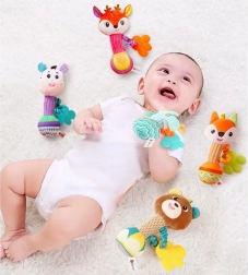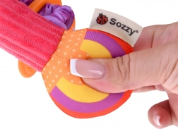 Puhában szövött anyagok és bordázott fogantyú segítik a fogást és a rázást, támogatva a finommotorikát és a kéz–szem koordinációt.
