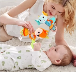 Ez a multiszenzoros játék biztonságérzetet és szórakozást nyújt a babának: belül kellemes hangú csörgő rejtőzik, a susogó anyagból készült fülecskék felfedezésre hívnak, a pocak megnyomására pedig vidám sípolás hallatszik. Kontrasztos színek és változatos textúrák természetes módon fejlesztik a látást, hallást és tapintást.