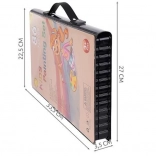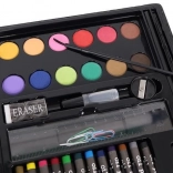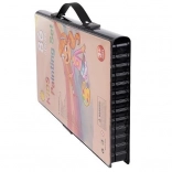 Festőkészlet 86 darabot tartalmaz, amelyek széles választékot nyújtanak rajzoláshoz és festéshez – 12 pasztellceruza, 24 erős filctoll, 12 olajpasztell, 12 viaszpasztell, 12 akvarell, szivacs, radír, ecset, olló, ceruza, hegyező, ragasztó, vonalzó, festőpaletta és 5 színes csipesz.