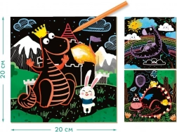 Ezzel a DODO kreatív szettel a gyerekek előre rajzolt vonalak mentén vagy teljesen saját fantáziájuk szerint kaparhatják elő a színes sárkánymotívumokat. Minden egyes mozdulat élénk színeket fed fel, amelyekből az egyszerű sablonból egyedi műalkotás válik.