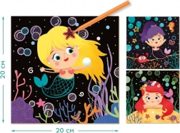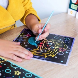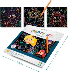 A csomagban három, 20 × 20 cm méretű, négyzet alakú kártyát és egy praktikus kaparópálcát találsz. A gyerekek követhetik a jelölt vonalakat, vagy szabadjára engedhetik fantáziájukat, és egyedi tengeri világot alkothatnak.