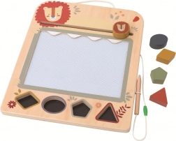A fa mágneses tábla aranyos oroszlánkölyök motívummal szórakoztató és egyben oktató játék 3 éves kortól. A mágneses tollnak és a négy pecsétnek köszönhetően a gyerekek fejleszthetik a finommotorikát, a kéz–szem koordinációt és a kreativitást. Könnyű törlés egy mozdulattal rendetlenség nélkül, így újra és újra lehet rajzolni.