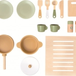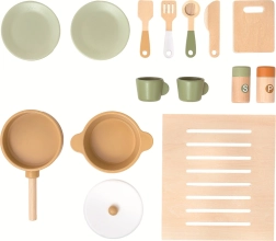 A csomag gazdag tartozékokat tartalmaz: tányérok, bögrék, serpenyő, fedeles lábas, só és bors, vágódeszka, konyhai eszközök és sütőrács. A masszív fa kivitel és a nem mérgező festékek biztonságot és hosszú élettartamot biztosítanak.