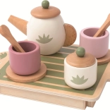 A fa teaszett ideális a mindennapi játékhoz – a gyerekek teát készíthetnek maguknak, barátaiknak és a családnak. A praktikus tálcán lévő fióknak a teakorongos filterekhez köszönhetően minden átláthatóan rendezett és bármikor kész a felszolgálásra.