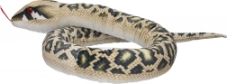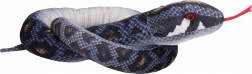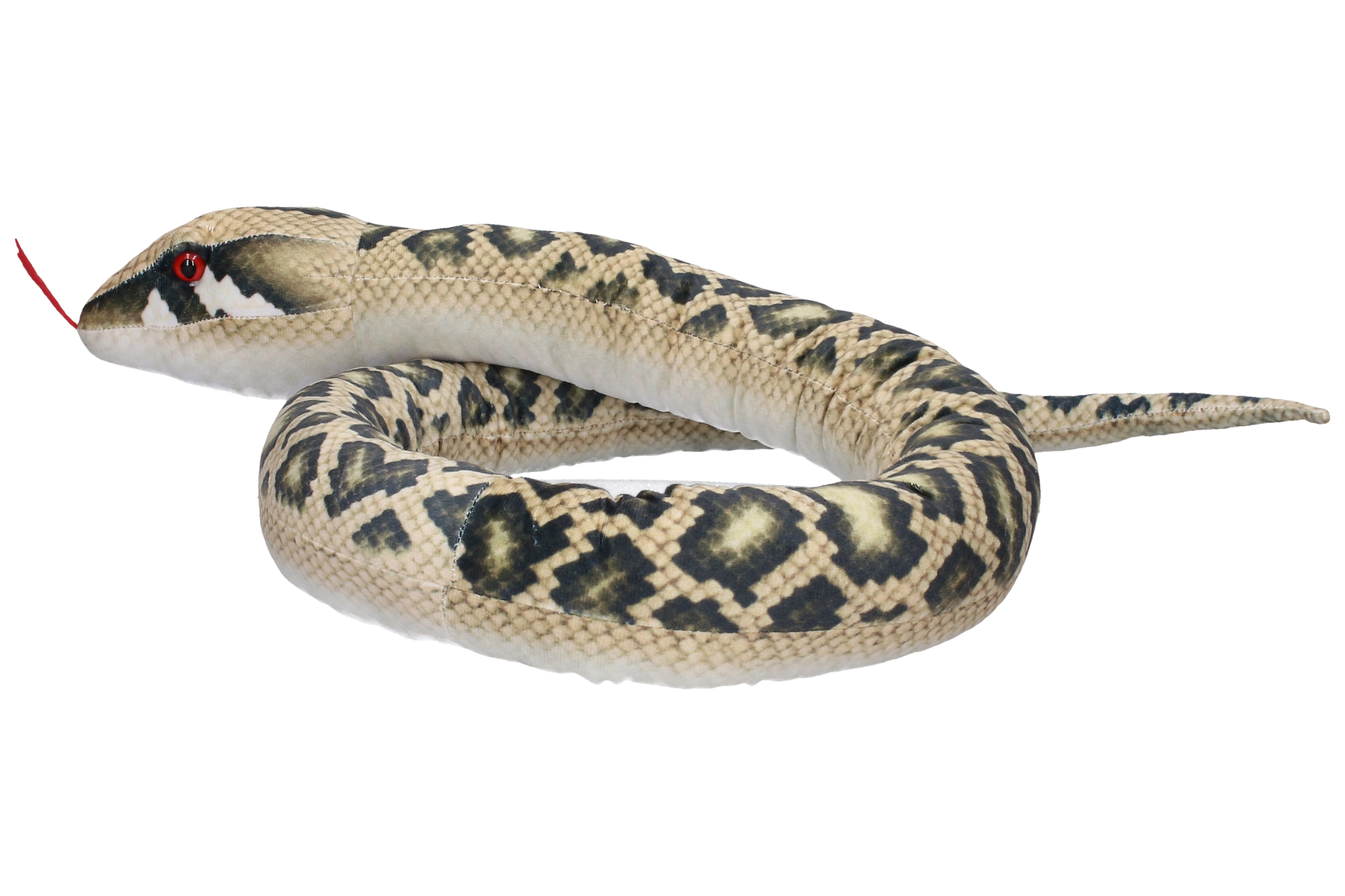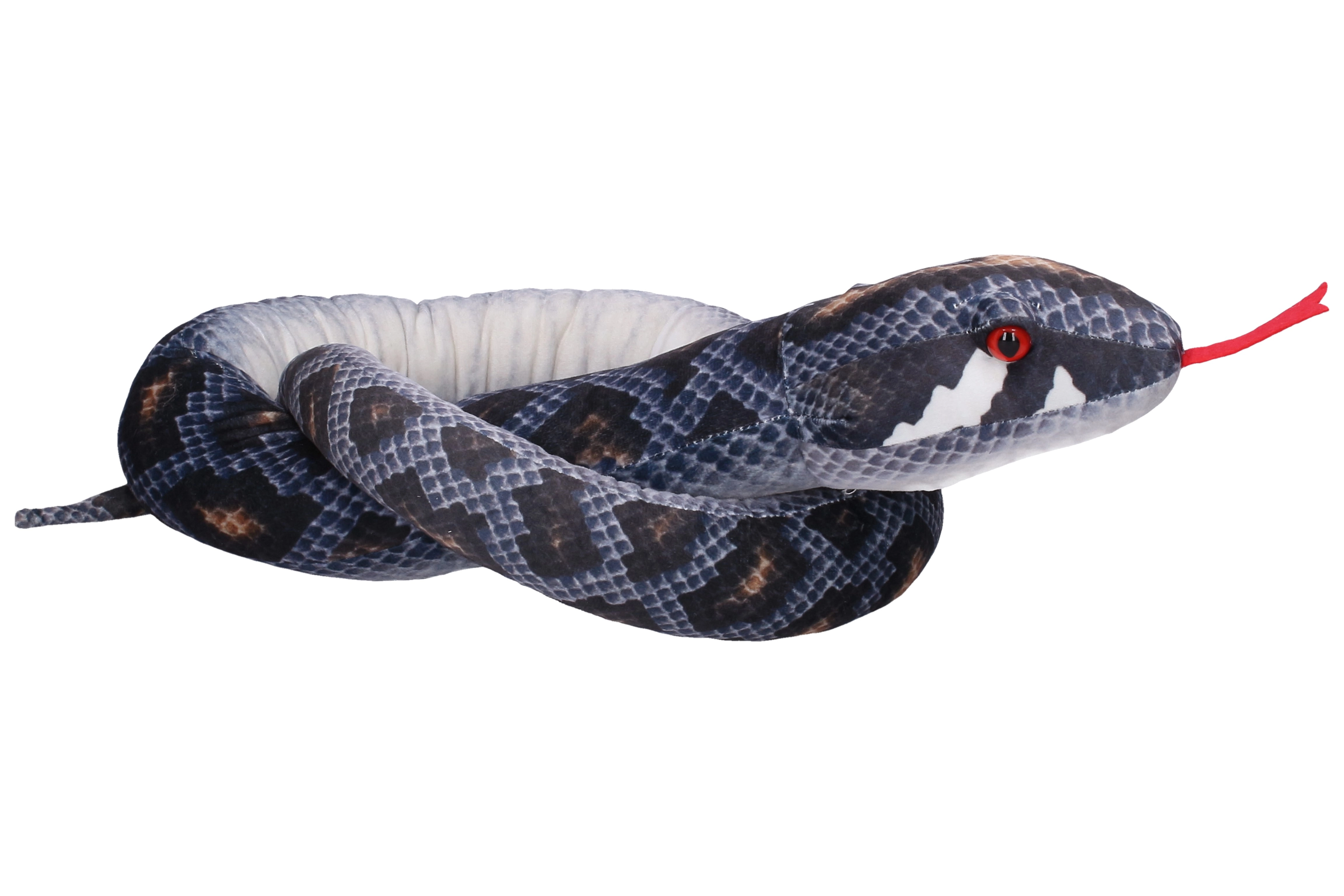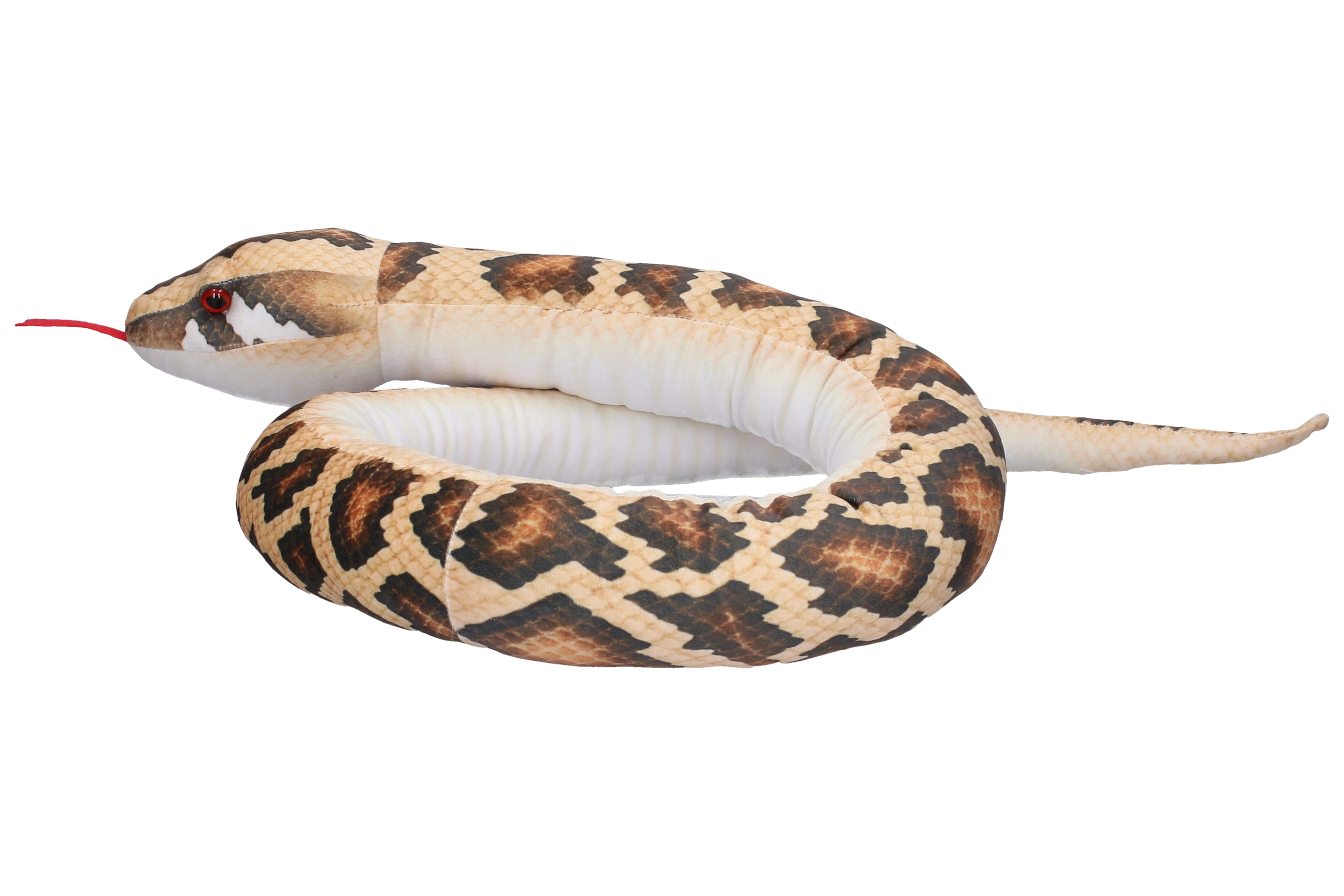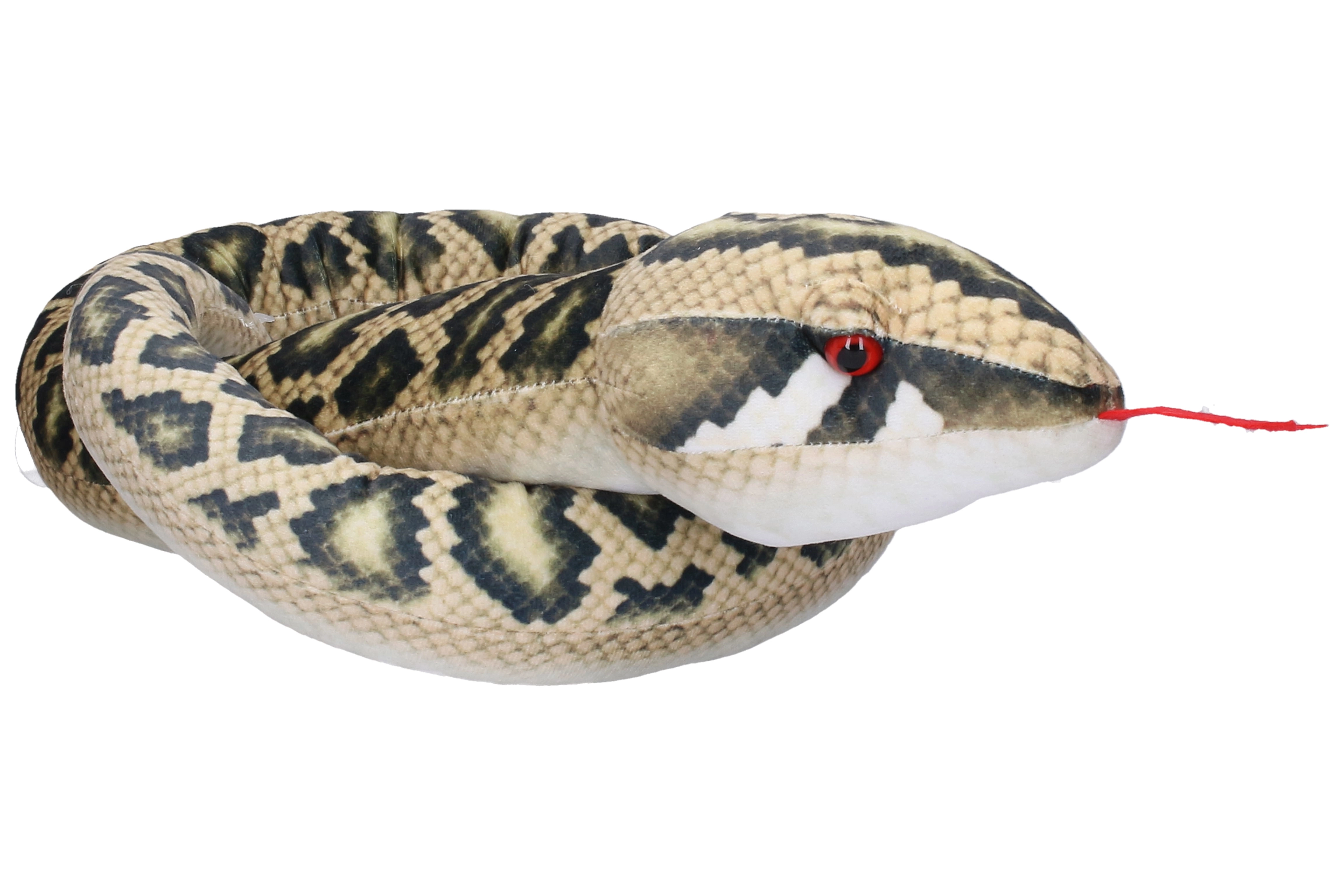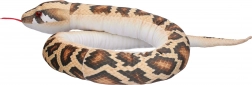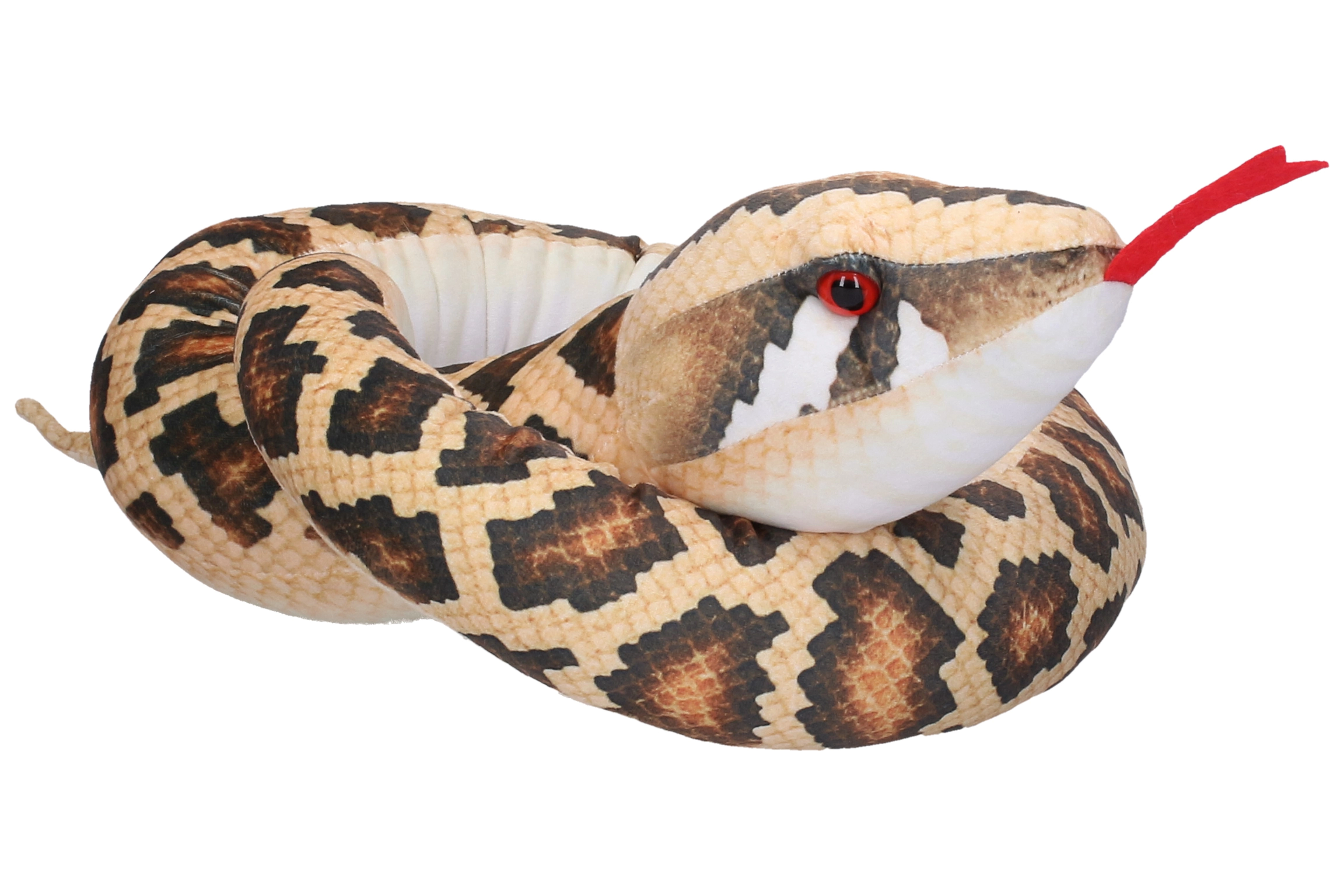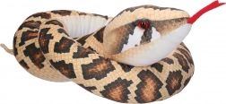 Élethű pikkelyminta, kifejező szemek és vörös, villás nyelv kölcsönöznek autentikus megjelenést a plüss kígyónak, amely örömöt szerez gyerekeknek és állatkedvelőknek.