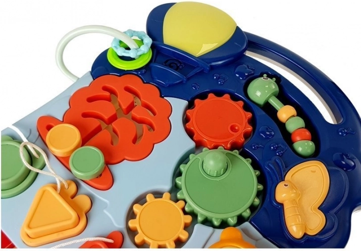 Forgó fogaskerekek, csúszkák, zsinóron lévő formák és nyomógombok fejlesztik a fogást, a szem–kéz koordinációt és a logikus gondolkodást.