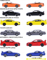 A nyitható részeknek (pl. ajtók, motorháztető vagy csomagtartó) és a szabadon futó kerekeknek köszönhetően a kisautók remek választás játékhoz és gyűjtői kiállításhoz is. A csomagban a NISSAN, MITSUBISHI, TOYOTA vagy HONDA márkák népszerű modelljei közül valamelyik lehet a Japan limitált szériából.