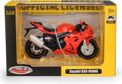 A piros SUZUKI GSX‑R1000 1:18 méretarányban a sportmotor hű mása, precíz részletekkel. A fém és műanyag elemek, a valósághű idomok és a nyomatok vonzó megjelenést garantálnak vitrinbe és játékhoz egyaránt.