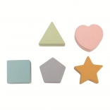 Öt, élénk színű bedobós forma segíti a gyerekeket a formák és színek felismerésében, valamint a fogás pontosságának és a térbeli észlelésnek a gyakorlásában.