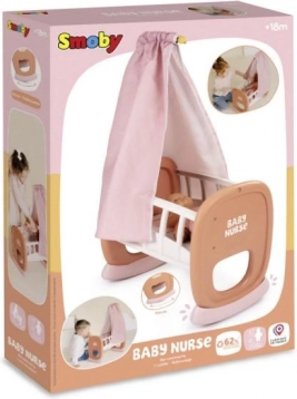 A bájos SMOBY Baby Nurse babaágy baldachinnal nyugodt alvást és finom ringatást biztosít a babának. Bölcsőként és kiságyként is szolgál, a baldachin könnyen levehető és mosható, a minőségi műanyag felületek pedig egyszerűen letörölhetők. 42 cm-ig terjedő babákhoz alkalmas, és Franciaországban készült újrahasznosított anyagok felhasználásával.
