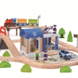 Ez a modern, forgalmas várost megidéző fa vonatkészlet mindent megad a gyerekeknek a hosszú, ötletes játékhoz. A készlet tartalmaz egy kék mozdonyt három vagonnal, változatos síneket, köztük emelt felüljárót, valamint tágas pályaudvart fedett peronnal. Nem hiányzik a rendőrautó, figurák, közlekedési táblák, lámpák, fák és további kiegészítők sem, amelyek valódi városi hangulatot teremtenek.