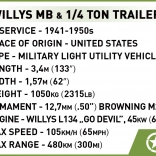 A második világháború legendás terepjárója a COBI építőkészletében kel életre: Jeep WILLYS MB utánfutóval. A modell kiemelkedik autentikus formáival, katonai színezésével és kiegészítőivel, beleértve a forgatható géppuskát, szerszámokat és a figurák fegyvereit. A minőségi kockáknak köszönhetően stabil, így intenzív játékra és vitrines kiállításra egyaránt alkalmas.