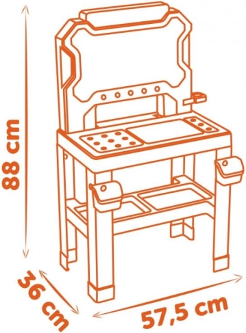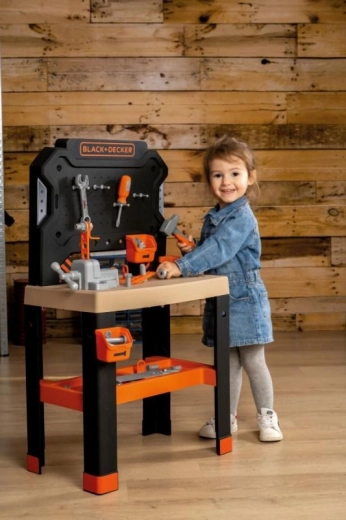 A Smoby Black+Decker Bricolo Center élethű gyermek műhely nagy, masszív munkapaddal, 78 db tartozékkal és 7 szerszámmal. A széles, fa hatású munkafelület, a satu, a tolómérce/praktikus vonalzó és a sok tárolórekesz órákon át tartó kreatív játékot biztosít. Nem hiányzik a szórakoztató szegek beütése funkció sem, és a fenntarthatóságra is hangsúly kerül – a termék legalább 75% újrahasznosított anyagot tartalmaz.