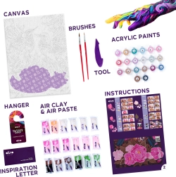 A készlet teljes körű – mindent tartalmaz, amire szüksége van a vászontól és a festékektől kezdve a modellező anyagon és eszközökön át. Ideális kreatív ajándéknak vagy saját készítésű lakásdekorációnak.
