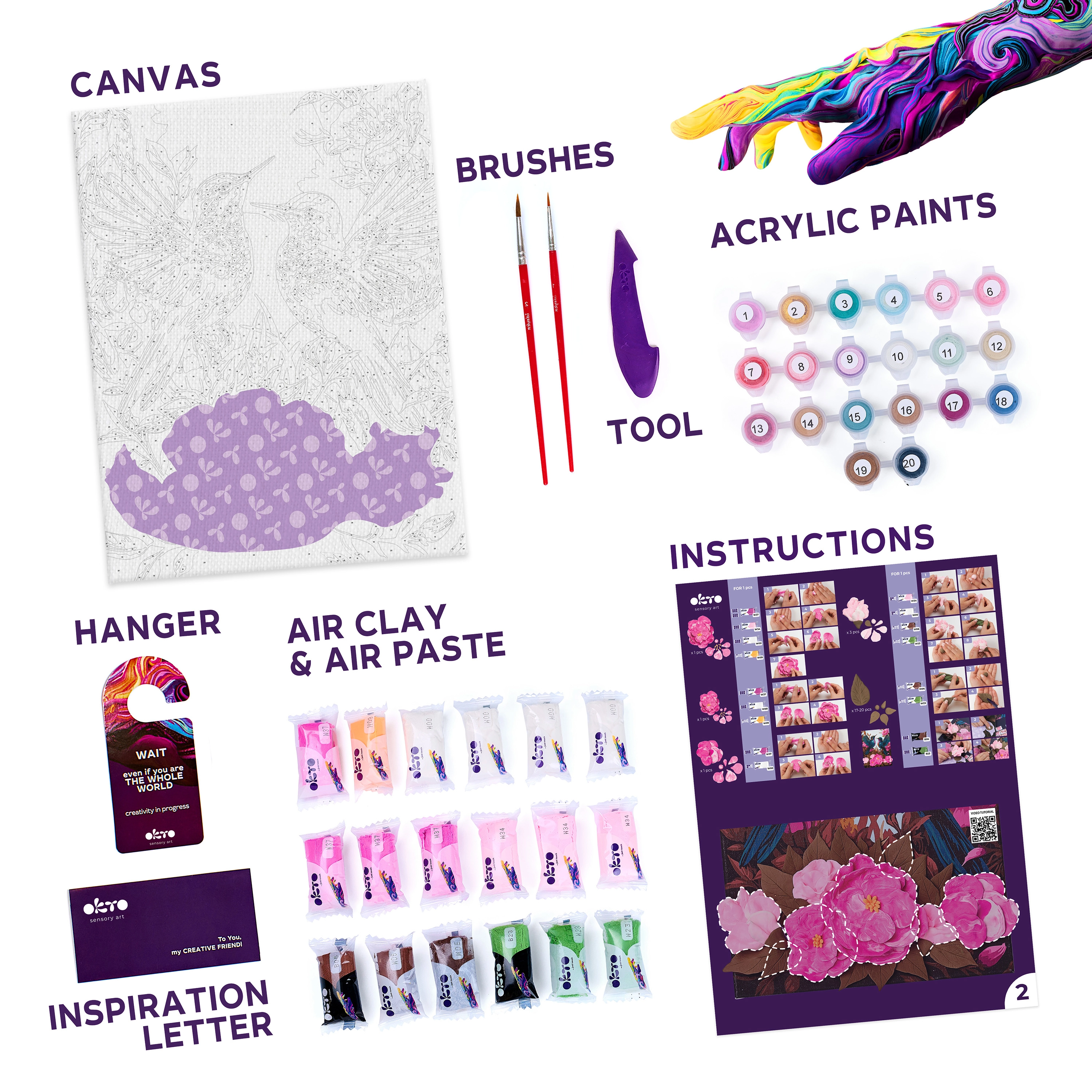 - Teljes készlet: vászon, festékek, ecset, útmutató, modellező eszköz és levegőn száradó gyurma.