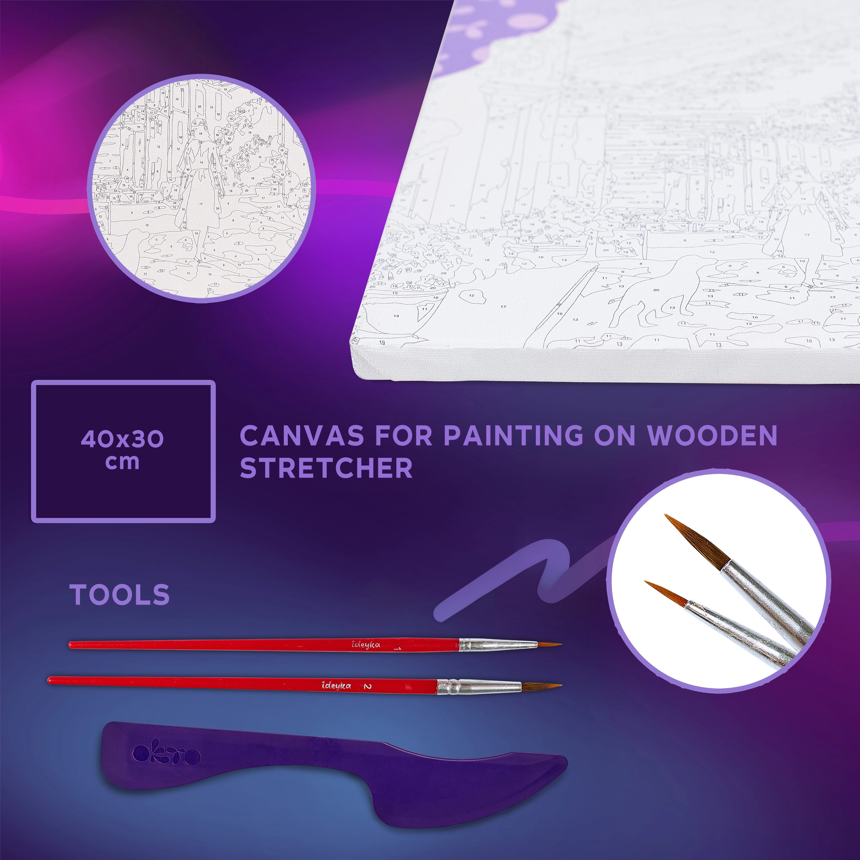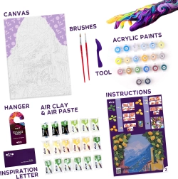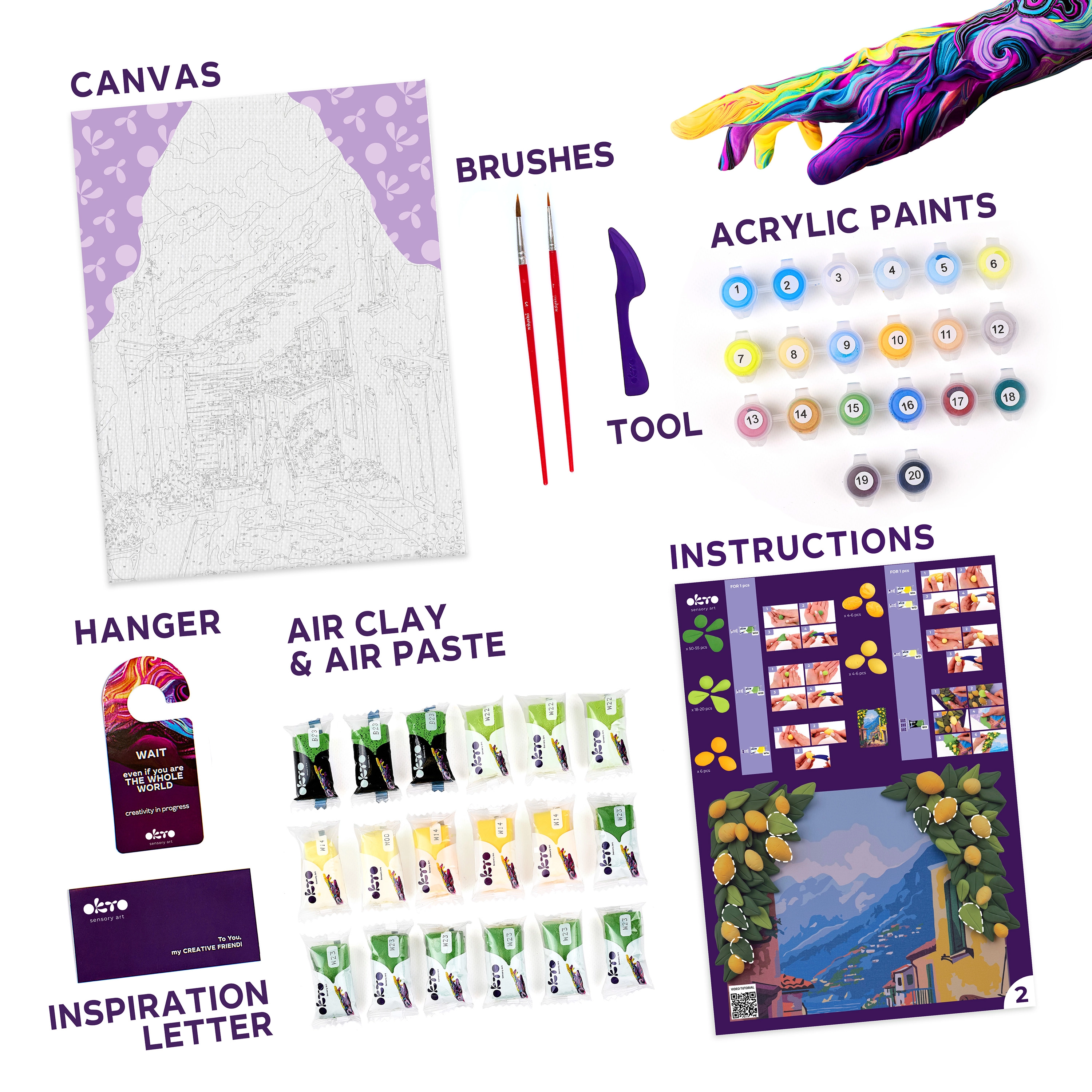 A csomag mindent tartalmaz, amire az alkotáshoz szüksége van – az előrenyomtatott vászontól a festékeken át egészen a modellező anyagig és eszközökig. Az útmutató egyszerű, teljesen kezdők is könnyedén boldogulnak vele.