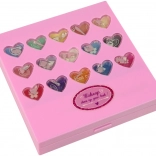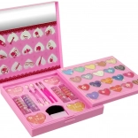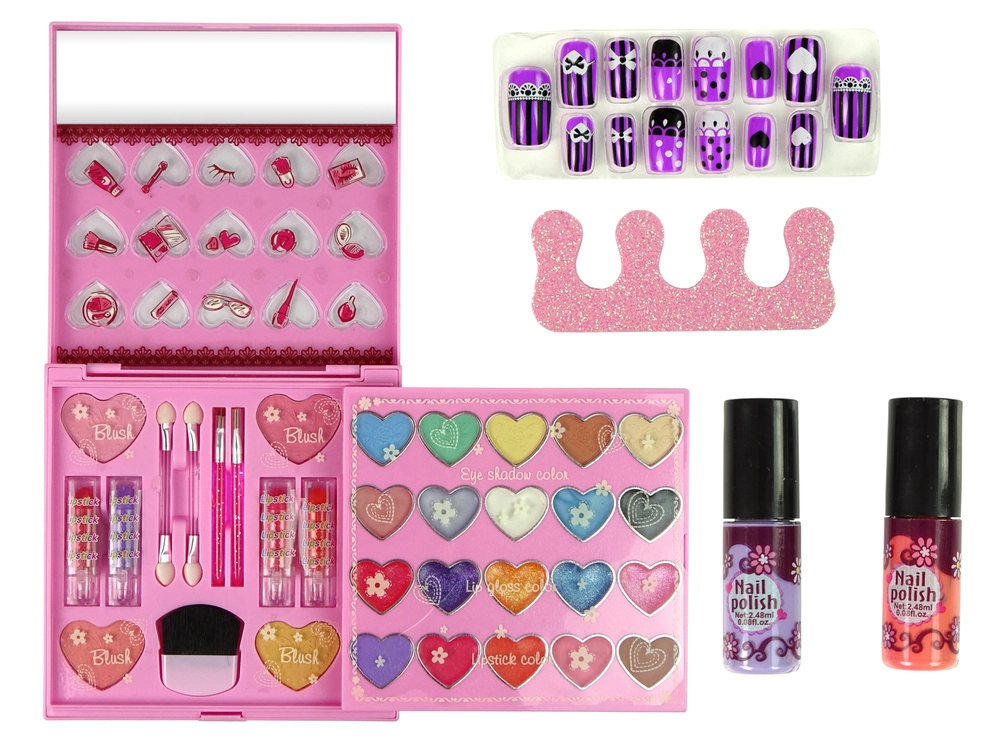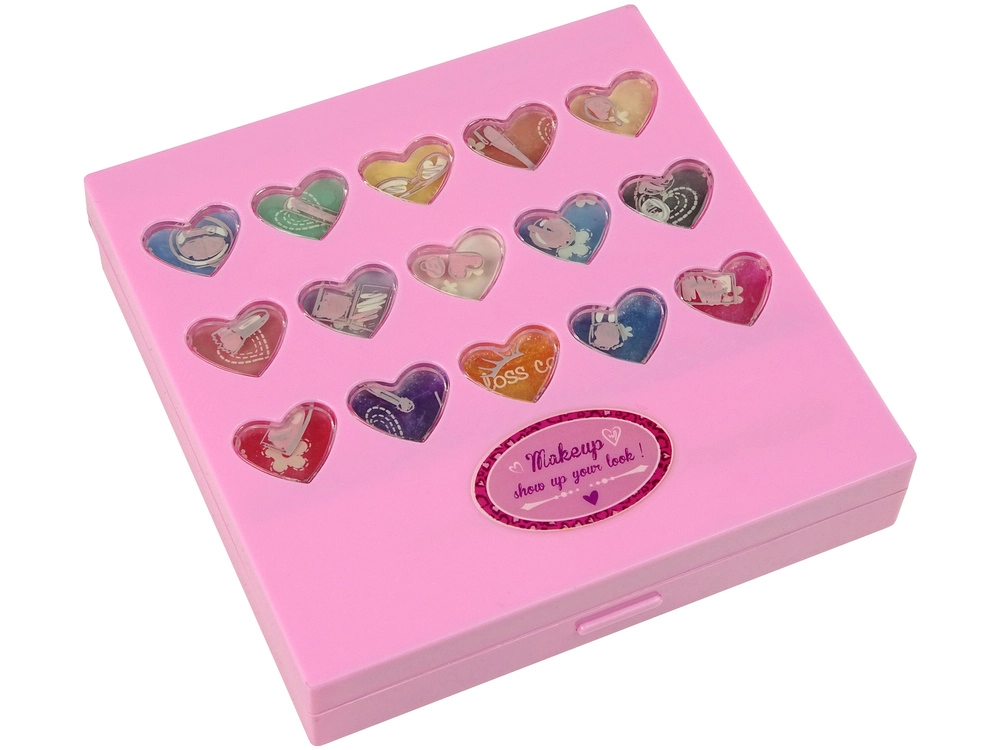Varázslatos rózsaszín paletta kis parádésoknak, amely mindent tartalmaz az első, biztonságos sminkeléshez: szemhéjfestékek, szájfények és rúzsok, pirosítók és körömlakkok. Az átlátszó szívecskéknek köszönhetően látható a színek gazdag palettája, miközben a kompakt kivitel minden kozmetikai kiegészítőt egyben tart. A kozmetikum parabénmentes, meleg vízzel és szappannal könnyen lemosható, valamint megfelel az EN 71 szabványnak és rendelkezik CE tanúsítvánnyal.