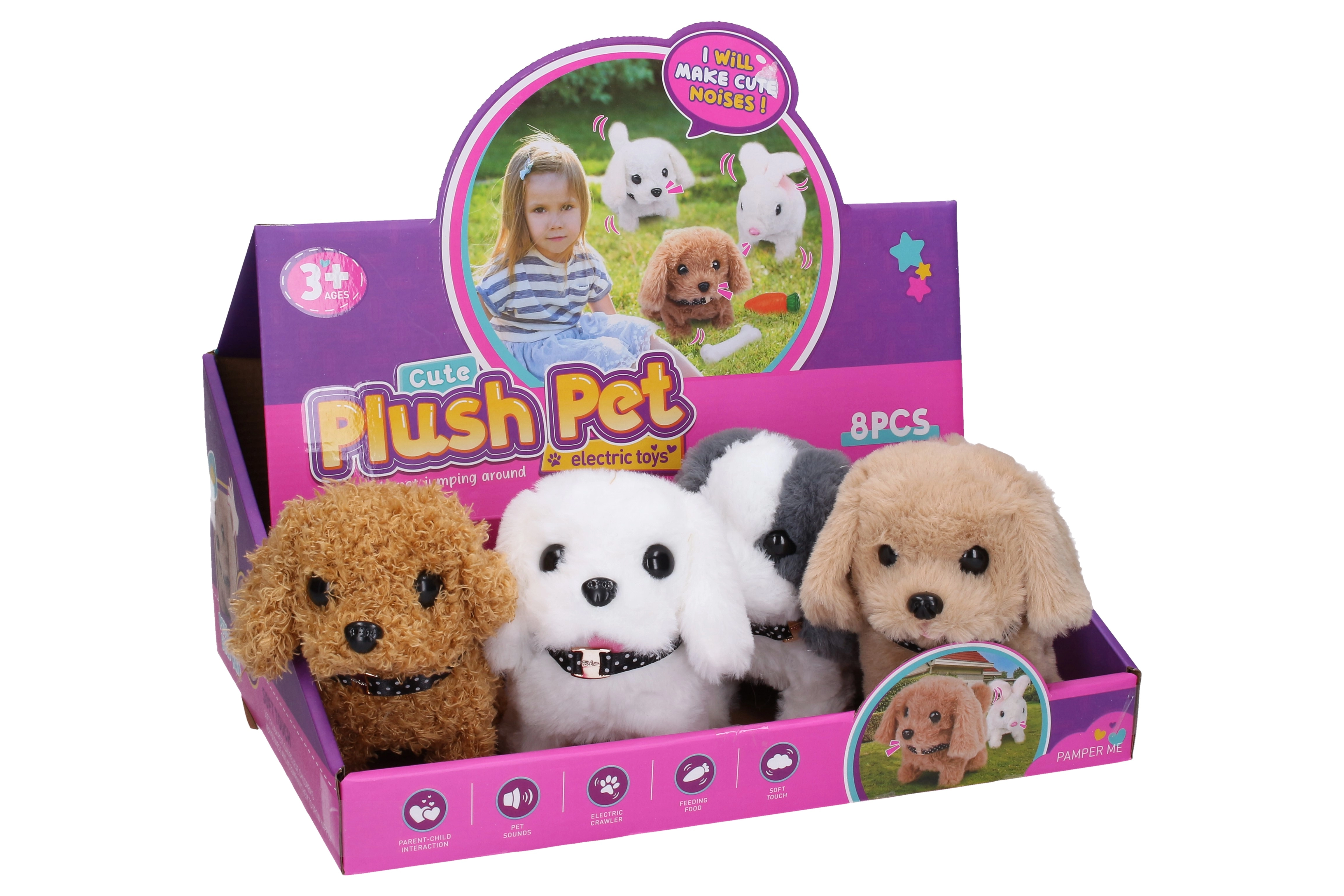 Aranyos, sétáló plüss kutyus 16 cm-es méretben, amely rengeteg szórakozást nyújt a gyerekeknek. Bekapcsolás után sétál, mozgatja a farkát és ugat. 3 színváltozatban kapható (fehér, barna, sárga). Egyszerű vezérlés az alján található ON/OFF kapcsolóval. Működéséhez 2× AA elem szükséges (nem tartozék).