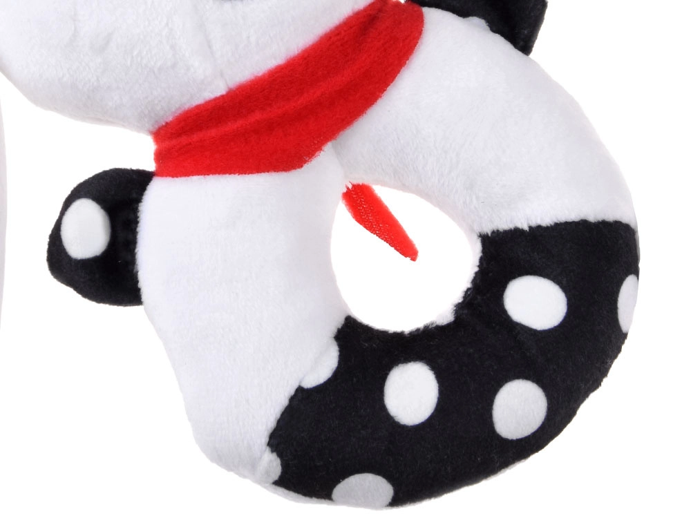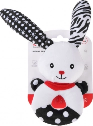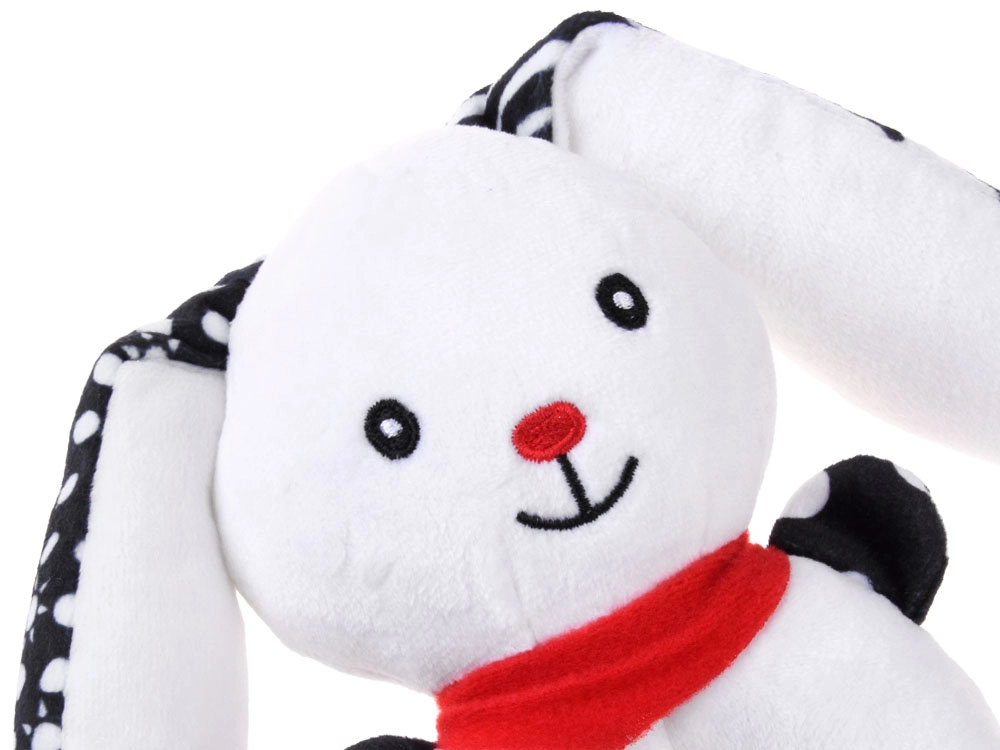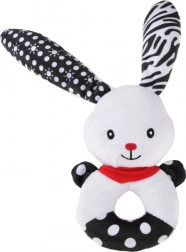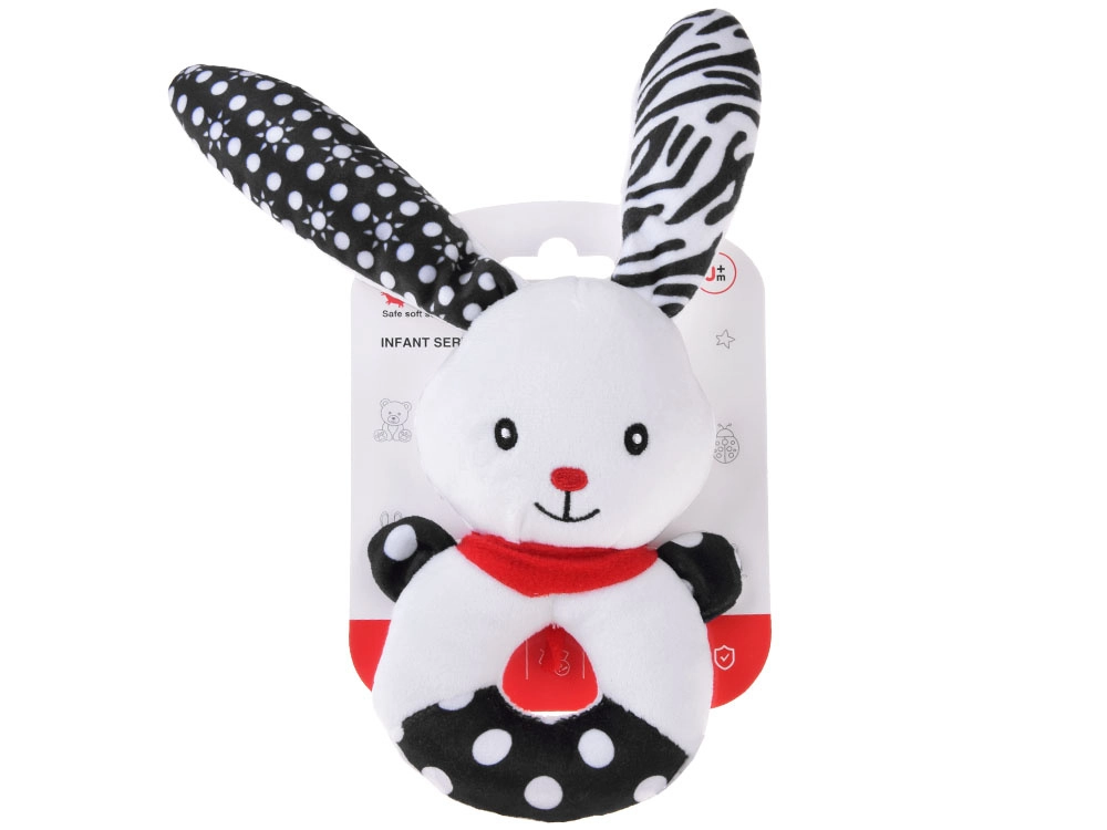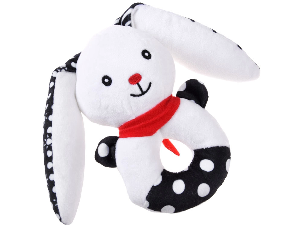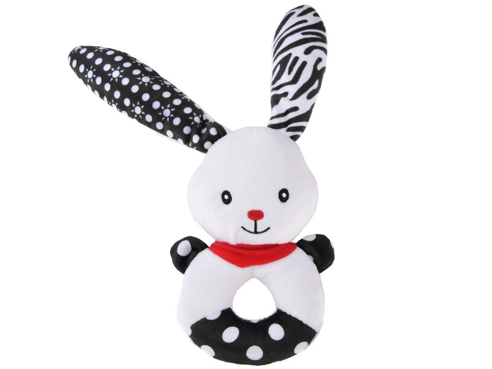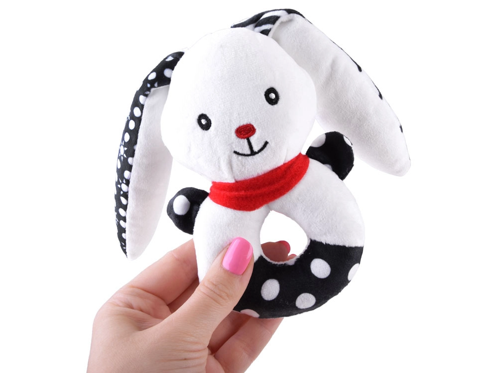 Ez a puha, kontrasztos játék egyesíti a csörgő, a síp és az első ölelgetni való játék funkcióit. A kerek, könnyen megfogható forma középső nyílással, kidomborodó fejrésszel és hosszú fülekkel segíti a finommotorika és a kéz–szem koordináció fejlesztését. A kontrasztos fekete-fehér motívumok jól láthatók a babák számára, és magukra vonzzák a figyelmet.