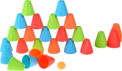 A poharak ügyességi játékokhoz is használhatók – a gyerekek tornyokat és pályákat építhetnek, időre mozgathatják vagy megfordíthatják a poharakat, illetve könnyű labdákkal dobhatnak kijelölt célokra. A játék támogatja a kéz–szem koordinációt, a koncentrációt és a reflexeket, valamint fejleszti a kreatív gondolkodást az egyedi építmények és feladatok kitalálásakor.