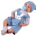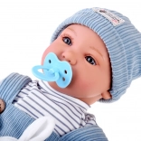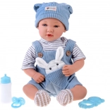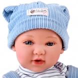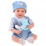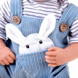 Ez az élethű baba ideális a gondoskodás gyakorlásához és a fantázia fejlesztéséhez. A puha pocak összebújásra hív, míg a műanyag fej és végtagok megkönnyítik az öltöztetést. A finom kék tónusú szett a kord kantáros nadrággal és sapkával stílusos és időtálló.