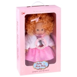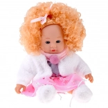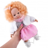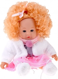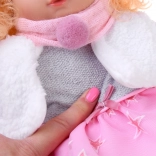A készlet része a téli öltözet: rózsaszín–szürke csillagos ruha, pihe-puha fehér kabátka, rózsaszín pomponos sál és puha mamusz. A beépített hangmodul többféle gyerekhangot játszik le, így a játék még interaktívabb és élethűbb.