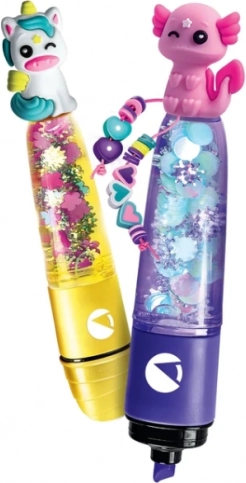 A csomag többféle színes tintát, üres kihúzófilc-testeket, apró díszeket és az összeszereléshez szükséges eszközöket tartalmaz. A gyerekek kiválasztják a színt, megtöltik a filcet, díszítik varázslatos állatfigurákkal, és máris kész az egyedi iskolai kiegészítő.