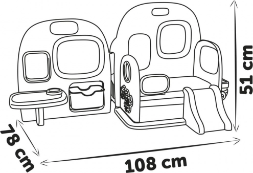 Része egy kis fürdőszoba WC-vel, mosdóval és WC‑papír tartóval, különálló emeletes ágy csúszdával a délutáni pihenőhöz, étkező és alkotó zóna kis törölhető táblával, valamint tárolóláda a kiegészítőknek. Játék után az egész központ egyszerűen összecsukható, a fogantyúval pedig kényelmesen hordozható vagy elrakható.