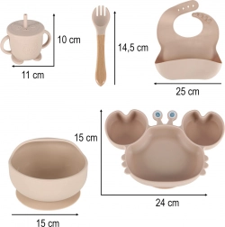 Ez a praktikus, puha szilikonból készült készlet mindent tartalmaz, amire a kisgyermekek mindennapi etetéséhez szükség van: rák alakú tányér három rekesszel, tapadókorongos tálka, pohár két tetővel (köztük szívószálas tető), négy evőeszköz és állítható zsebes előke. A tapadókorongok a tányéron és a tálkán megakadályozzák a felborulást és az elcsúszást, míg a rekeszek segítenek elkülöníteni az egyes adagokat.