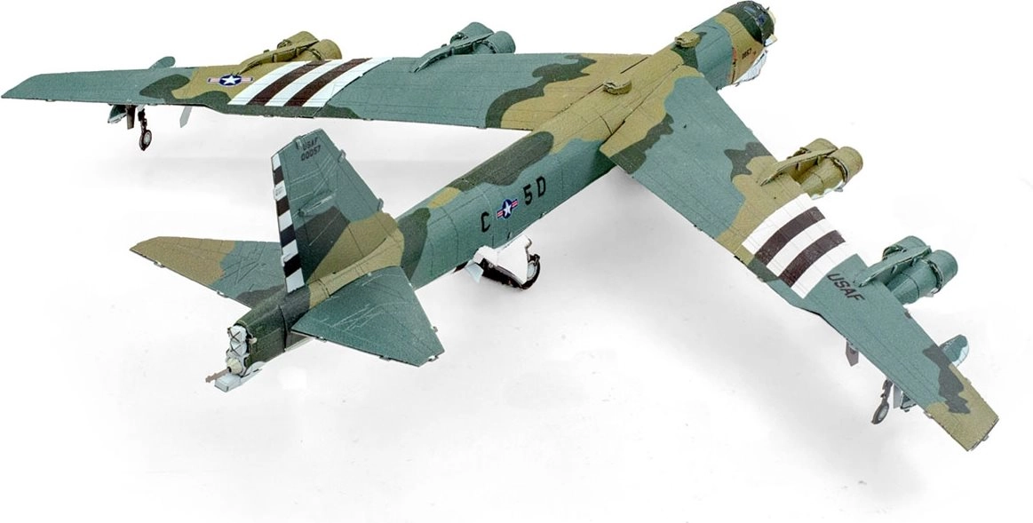 A lézergravírozott részletek valósághű paneleket, feliratokat és felületi struktúrát adnak a B-52 modellnek, amely bármely vitrinen vagy kiállítóhelyen kitűnik.