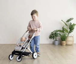 A babakocsi két babának készült, támogatja a társas játékot és a gondoskodó készségek fejlődését.