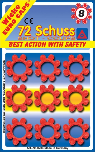 A csomagban 9 tárcsát találsz, amelyek együtt 72 lövést biztosítanak. A kapszlik ideálisak szabadtéri játékhoz, születésnapi bulikhoz és tematikus jelmezekhez.