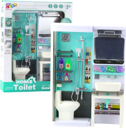 Realista gyermek fürdőszobai készlet WC-vel, zuhannyal, megvilágított tükrös mosdóval és bőséges higiéniai kiegészítőkkel. Az interaktív fény- és hangeffektek támogatják a kreatív szerepjátékot, tanítják a higiéniai szokásokat, és fejlesztik a képzelőerőt.