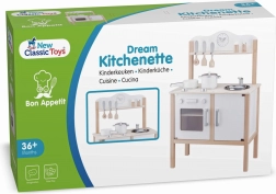 Stílusos, fehér színű, fából készült gyerekkonyha 3 éves kortól, amely órákon át tartó kreatív játékot kínál. Található benne kétégős főzőlap, átlátszó ajtós sütő, kivehető mosogató, tárolópolcok és óra mozgatható mutatókkal. A csomag része egy fedeles lábas, egy serpenyő, 3 darab fa konyhai eszköz és egy sószóró borsszóróval – minden a valósághű főzőcskézéshez és a szociális készségek fejlesztéséhez.