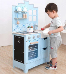 Stílusos, világoskék, fából készült játékkonyha 3 éves kortól kis szakácsoknak. Tartalmaz egy mosogatót csappal, ablakos sütőt, mikrohullámú sütőt és bőséges tartozékokat a valósághű játékhoz. A masszív fa szerkezetnek, a forgatható gomboknak és a praktikus tárolóhelyeknek köszönhetően fejleszti a finommotorikát, a képzeletet és a koordinációt. A munkalap magassága 55 cm, a teljes méret 60 × 30 × 100 cm.