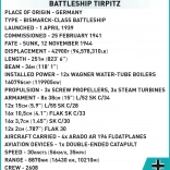 A Historical Collection sorozat COBI TIRPITZ készlete hűen idézi meg a második világháború híres német csatahajóját – a BISMARCK testvérhajóját. Az 1:300 méretarány valósághű arányokat, jellegzetes álcafestést és gazdag részleteket nyújt, beleértve a tornyokat, radarárbócokat és csónakokat. A modell impozáns, 87 cm-es hosszával kiválóan mutat polcon vagy vitrinekben.