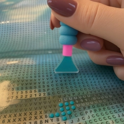 A bordázott tálca, az applikátor és a viasz biztosítja a kövecskék precíz felvételét és elhelyezését a vásznon lévő szimbólumoknak megfelelő helyekre.